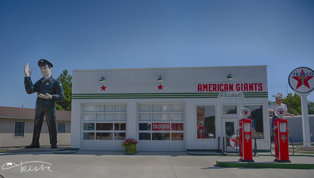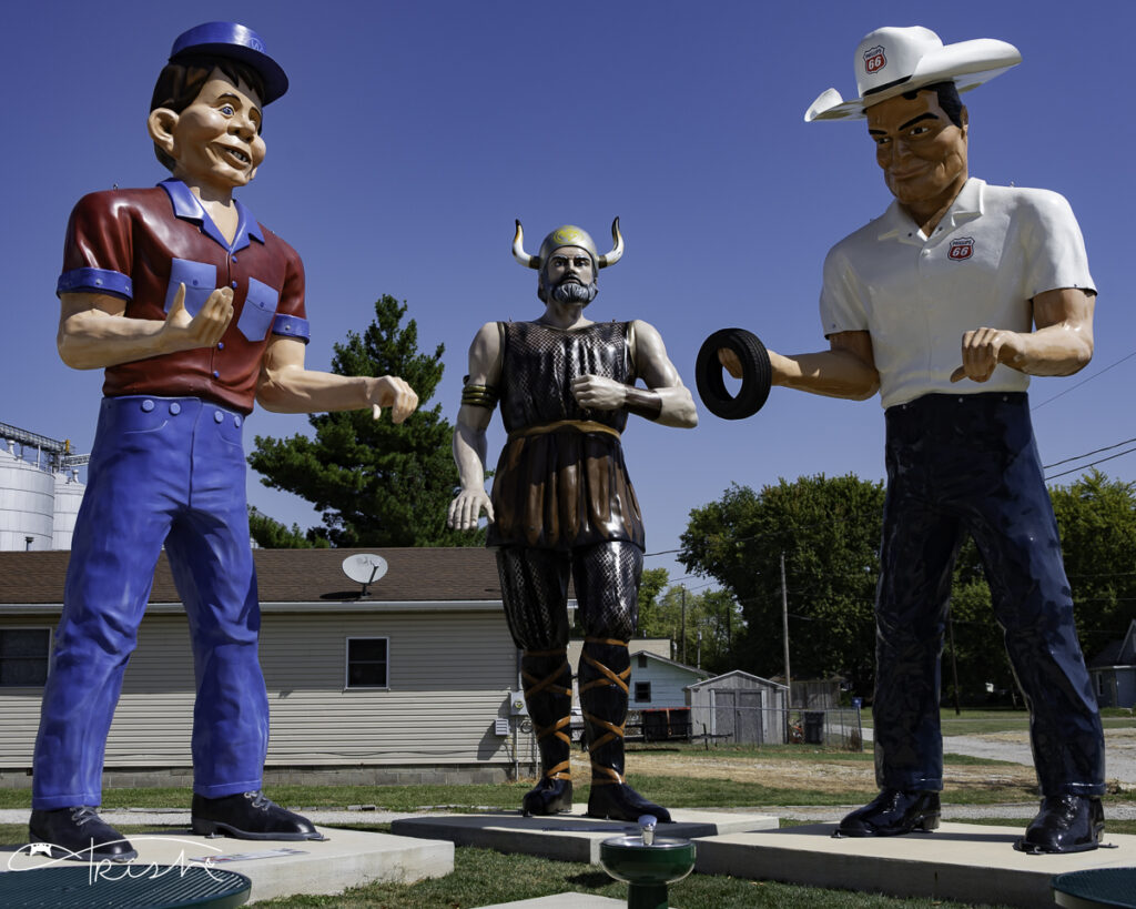 We finished our trek through Normal and headed on our way through Funk’s Grove and into Atlana where we were able to see Paul Bunyan holding a giant hot dog and more Muffler men at the American Giants Museum.